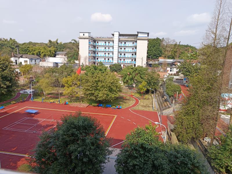 休闲广场全景,绿树成荫,悠闲养老